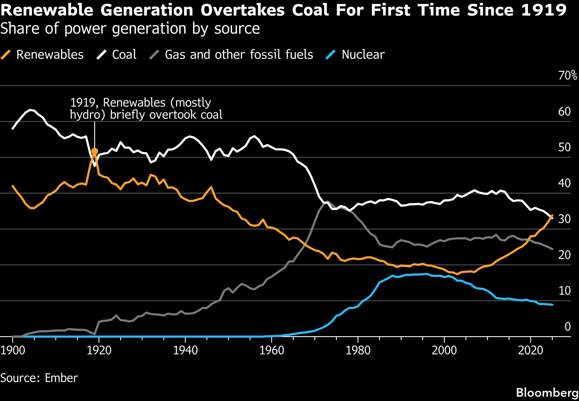 Solar, wind and other renewables made up 34% of global electricity generation in 2025, overtaking coal’s 33% share for the first time since 1919, when demand was a tiny fraction of current levels, according to the report.