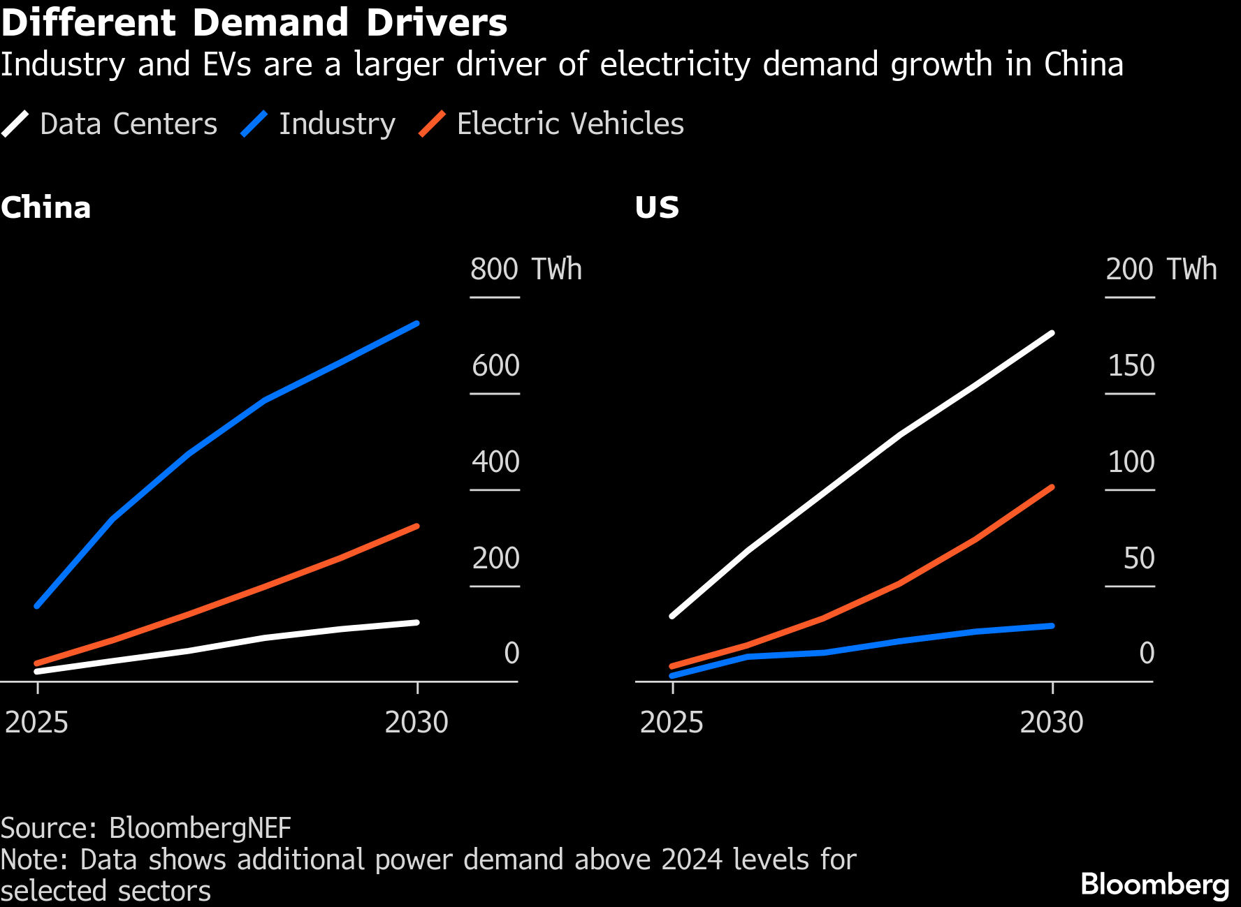 AI will account for a smaller share of total power demand in China than the US in part because of the impact of the Asian nation’s other energy-hungry sectors, including industry and electric vehicles — both of which will add electricity consumption at a faster rate through 2030.
