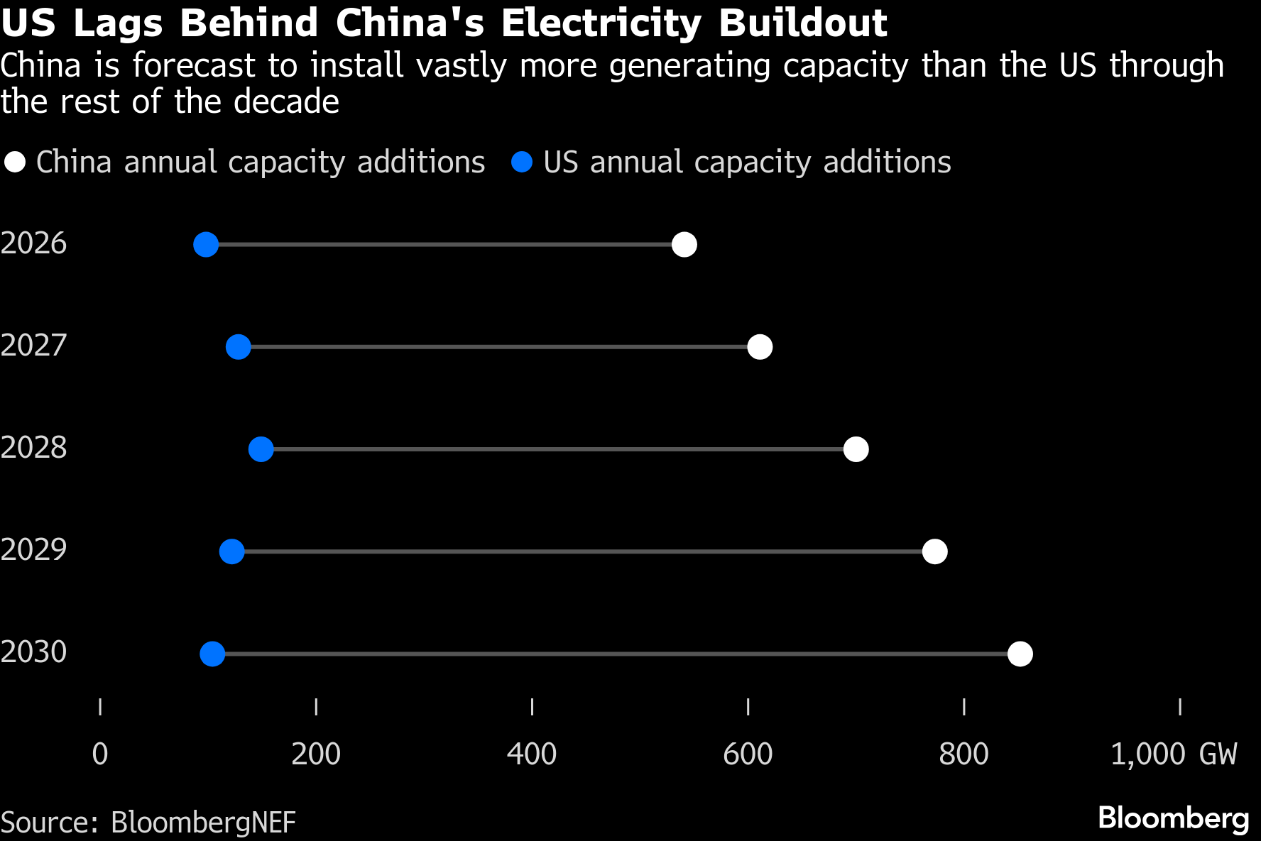 China will add more than 3.4 terawatts of electricity generation capacity over the next five years, almost six times as much as the US, BloombergNEF projects under its base-case Economic Transition Scenario. That influx would give the No. 2 economy greater ability to accommodate rising power demand from data centers.