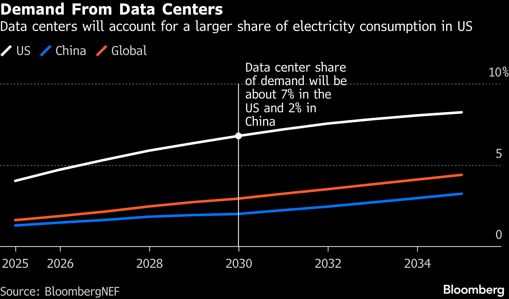 In the US, data centers will account for 38% of the growth in electricity demand between 2024 and 2030, though just 6% in China, according to BNEF projections. Data centers will command almost 7% of total US power demand by 2030, compared to 2% in China.