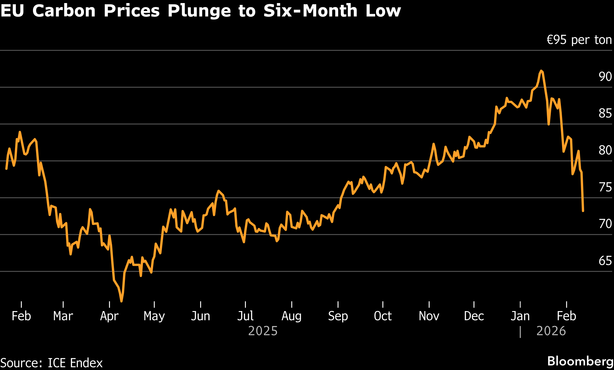 Benchmark carbon allowances fell as much as 8% — the biggest drop since May 2022 — to €72.18 per ton as of 12:11 a.m. CET on ICE Endex. Merz said on Wednesday the EU carbon market was meant to cut emissions while helping companies transition to clean production.