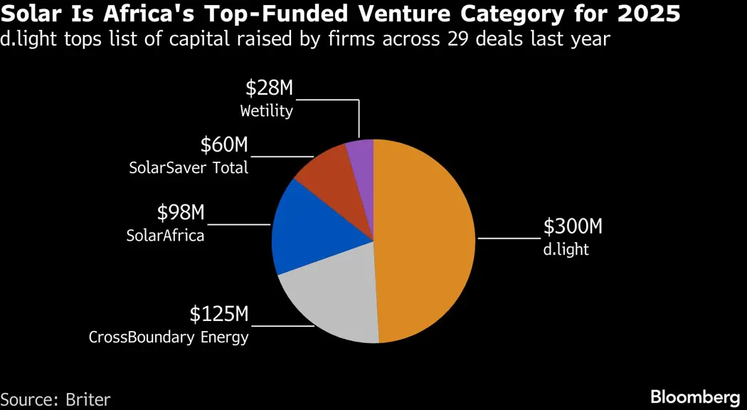 (Bloomberg) -- Solar and renewables are vying with fintech and payments as the top draws for African venture capital, with investors viewing energy projects as the most attractive on the continent’s startup scene, a study found.