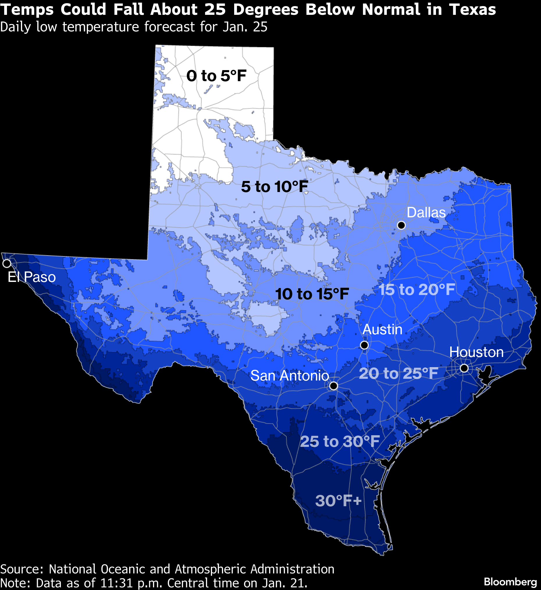 The main threats to most of Texas will be ice on power lines and trees as temperatures plunge. Dallas is expected to dip to 8F Sunday night, with Houston falling to 22F, the weather service said. Snow will be mainly across far northern Texas and the Panhandle, but many areas in the central part of the state will get between 0.25 to 0.5 of an inch of ice, which can snap tree branches and drop power lines, Hurley said.