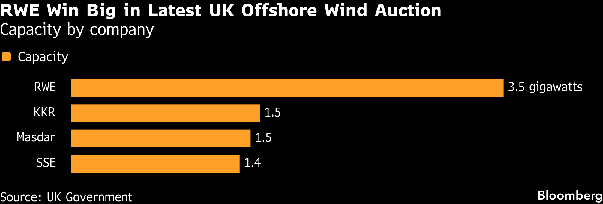 RWE AG was the major winner, involved in all but one of the projects that won. Separately, RWE said it has agreed a deal with KKR & Co to develop, construct and operate the Norfolk Vanguard East and Norfolk Vanguard West projects, which were awarded contracts in the auction.