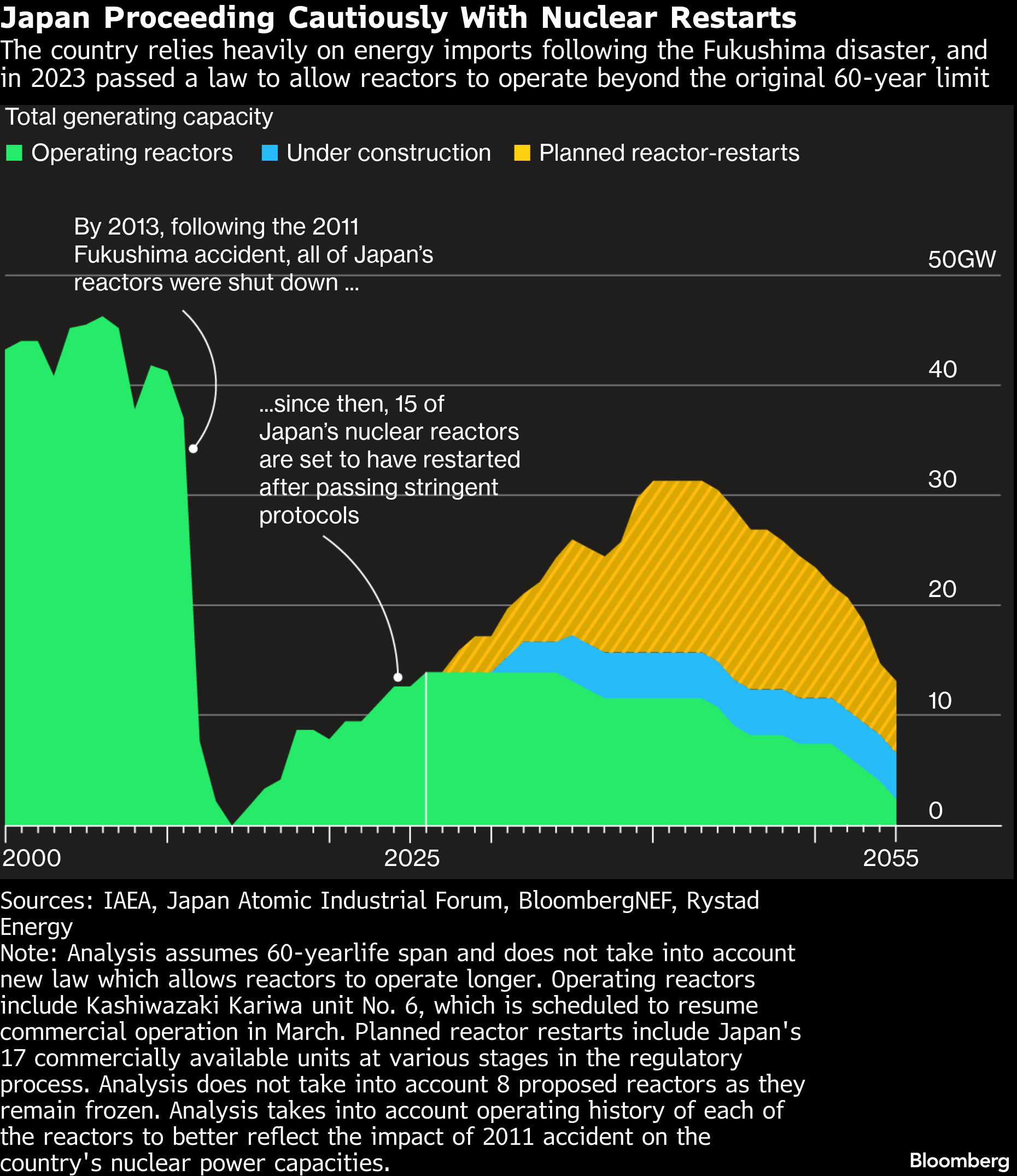 Japan — a resource-scarce nation which until the 2011 Fukushima disaster had ambitions for nuclear to provide 50% of its power — is pushing ahead with atomic energy again. However, new reactors will take more than a decade to come online, and even that depends on lengthy regulatory checks.