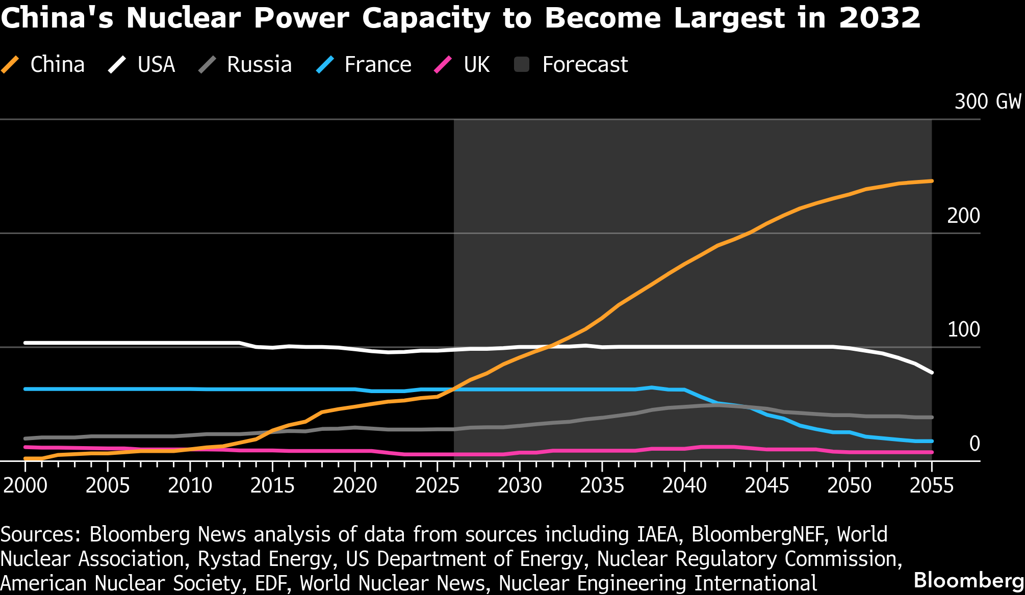 And yet in much of the world — from the US to France, Europe’s nuclear powerhouse — those lofty ambitions are at odds with the reality of an industry hollowed out by decades of stagnation.A Bloomberg News analysis of company announcements, construction pipelines and industry forecasts suggest the current push comes too late to stop China’s nuclear capacity from overtaking the US fleet at the start of the next decade. Today, the US is the biggest producer of electricity from splitting atoms, but its output will plateau over the next decade. Others, like Japan, are struggling to maintain their capacities.