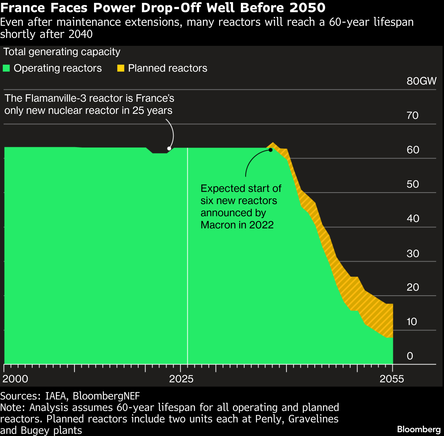 France has traditionally been a heavy used of atomic power and has one of the world’s largest fleets. Nuclear made up 70% of the European nation’s power mix in 2025, according to Ember.French President Emmanuel Macron has announced plans for six new units, but the target date for the first has already been pushed back three years to 2038. Even so, the projects will do little to replace an avalanche of planned retirements when facilities reach the 60-year mark.