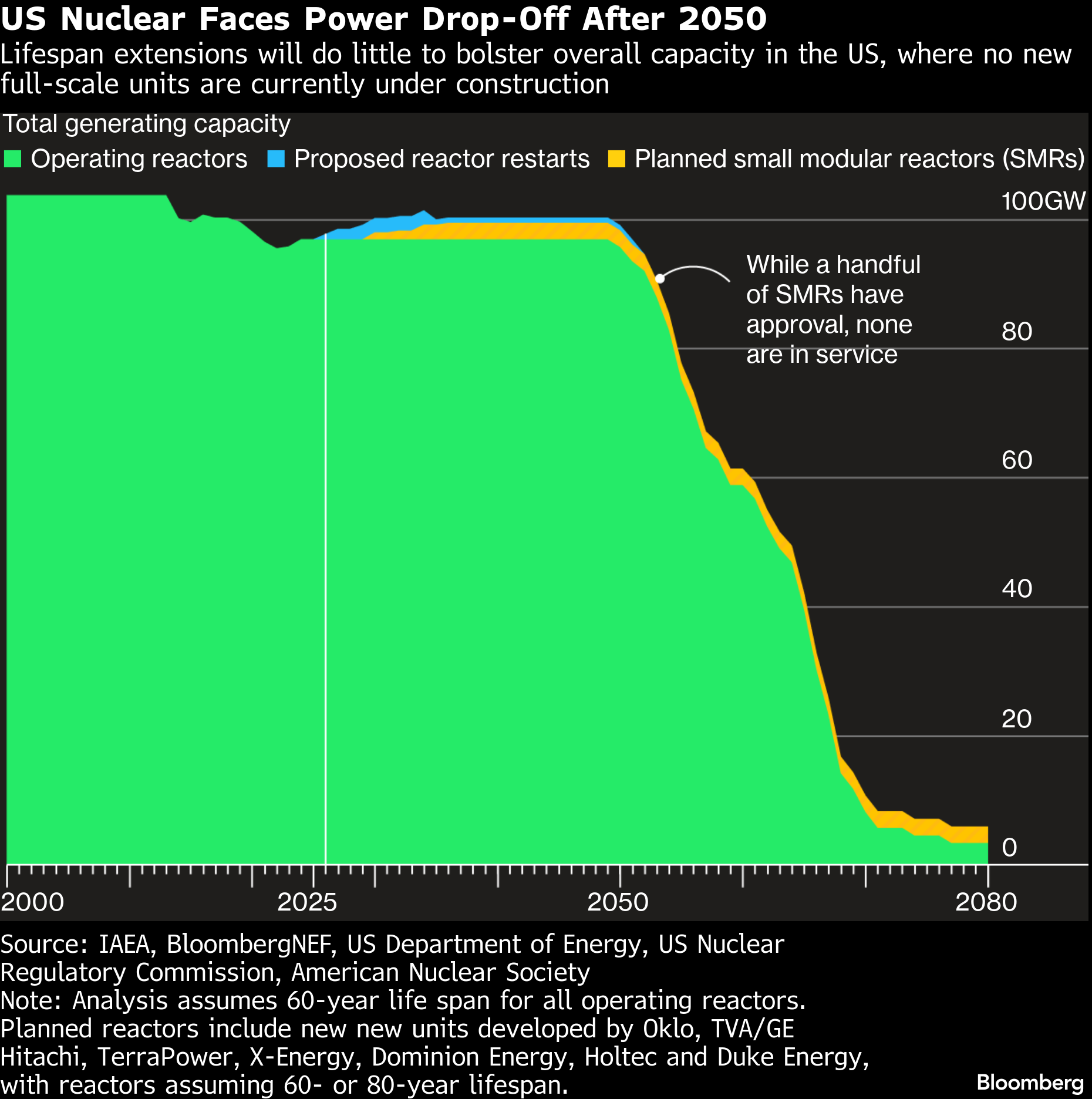 Today, the US has 94 reactors, with an average age of 44 years — past the typical lifespan of four decades that the license authorizes. Most operators renew their permits for an additional 20 years, and with many seeking approval for the second time, the generating units can typically run for as long as 80 years. The Trump administration’s executive orders have sought to expedite small modular and advanced reactors, newer technologies that are expected to form the backbone of new construction. Yet none have started full-scale building. While dozens of firms have plans for small modular reactors, only one has design certification — NuScale Power Corp. In the near term, America’s only solution is to run its existing fleet for longer. There are plans and proposals to reopen plants that have been closed— most famously Three-Mile Island, which will provide Microsoft Corp. with carbon-free electricity.