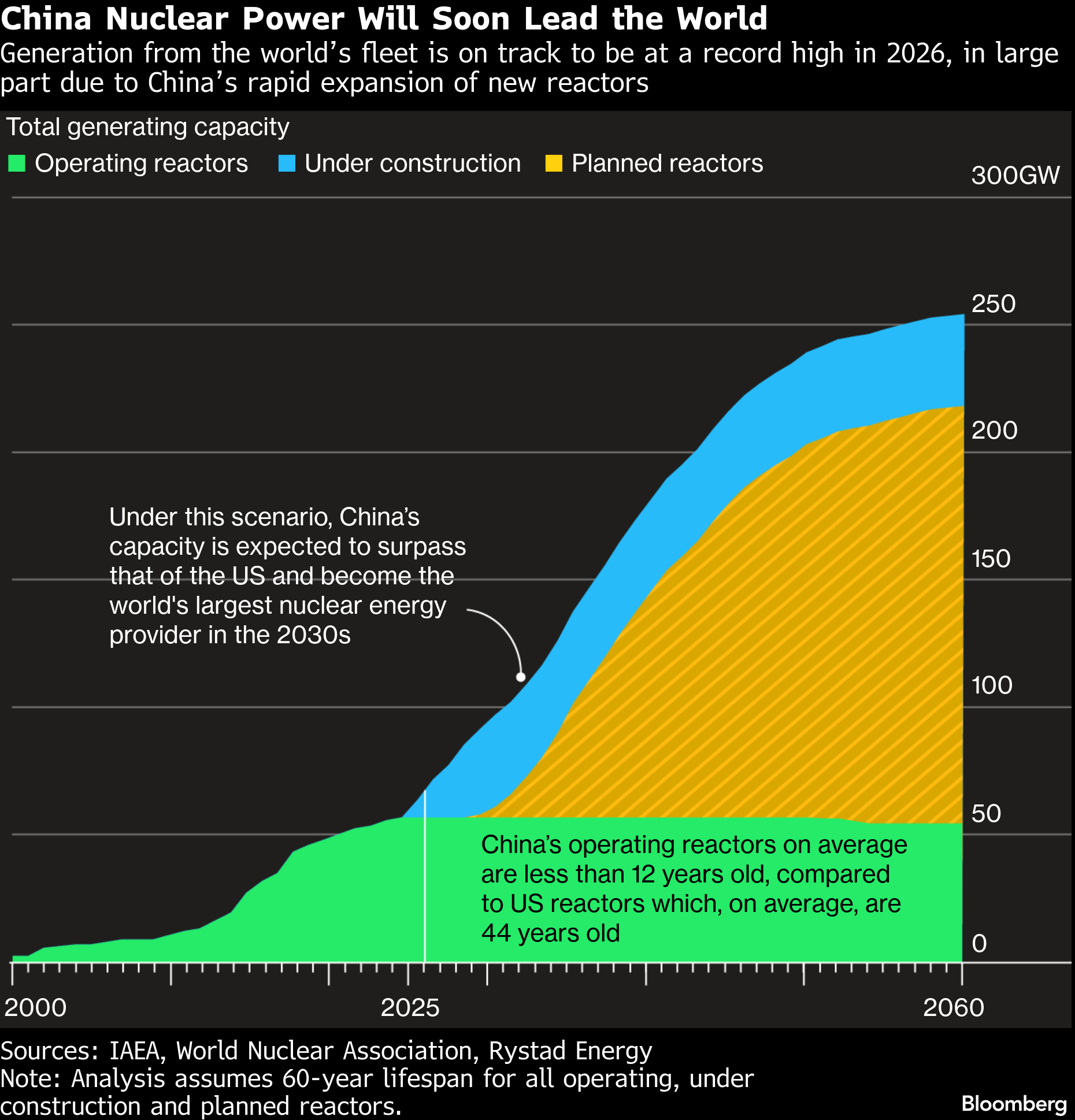 China stands in stark contrast. It’s building reactors at an unprecedented pace — as many as 10 units a year — backed by state financing and a homegrown supply chain, as it pursues energy security, cleaner air and technological dominance. If current construction plans and projections hold, it will overtake the US’s capacity by 2032, the data show.
