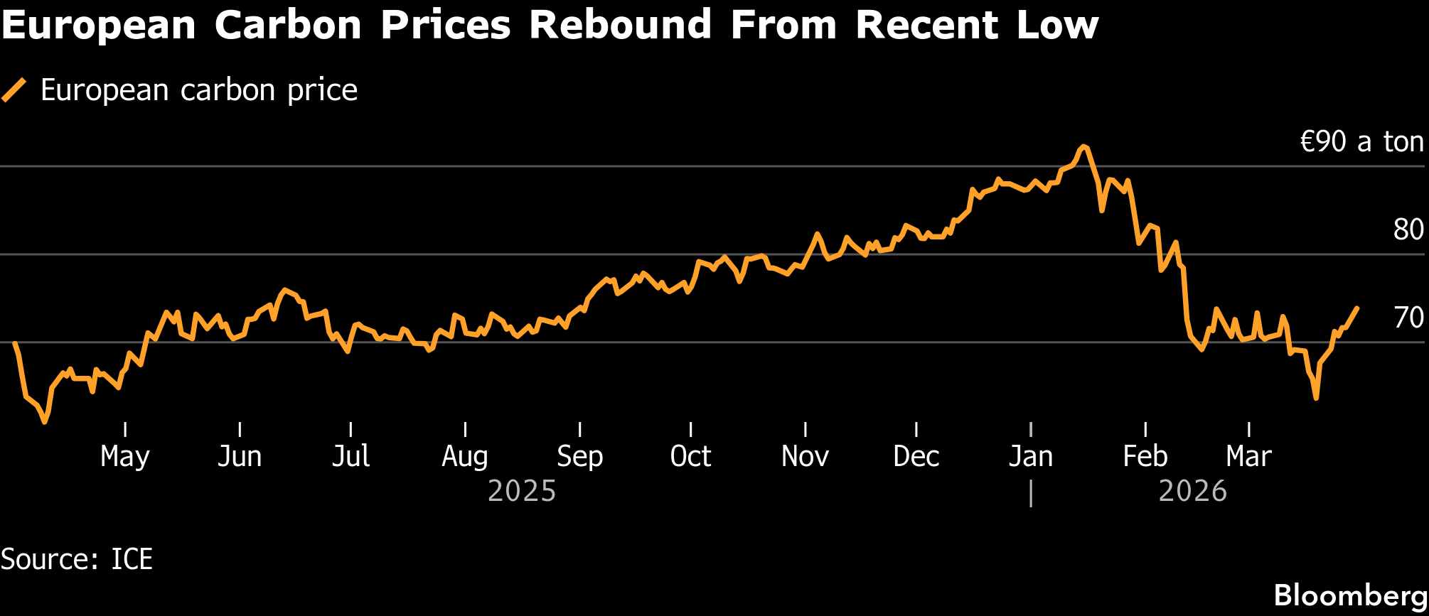 Carbon prices have rebounded about 17% since touching a low on March 19, and reached the highest in more than two weeks on Monday.
