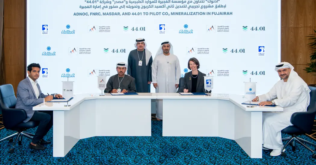ADNOC, a reliable and responsible provider of lower-carbon intensity energy, on Tuesday announced a partnership with the Fujairah Natural Resources Corporation (FNRC), Abu Dhabi Future Energy Company (Masdar) and 44.01 to pilot technology that permanently mineralises carbon dioxide (CO2) within rock formations found in the Emirate of Fujairah.