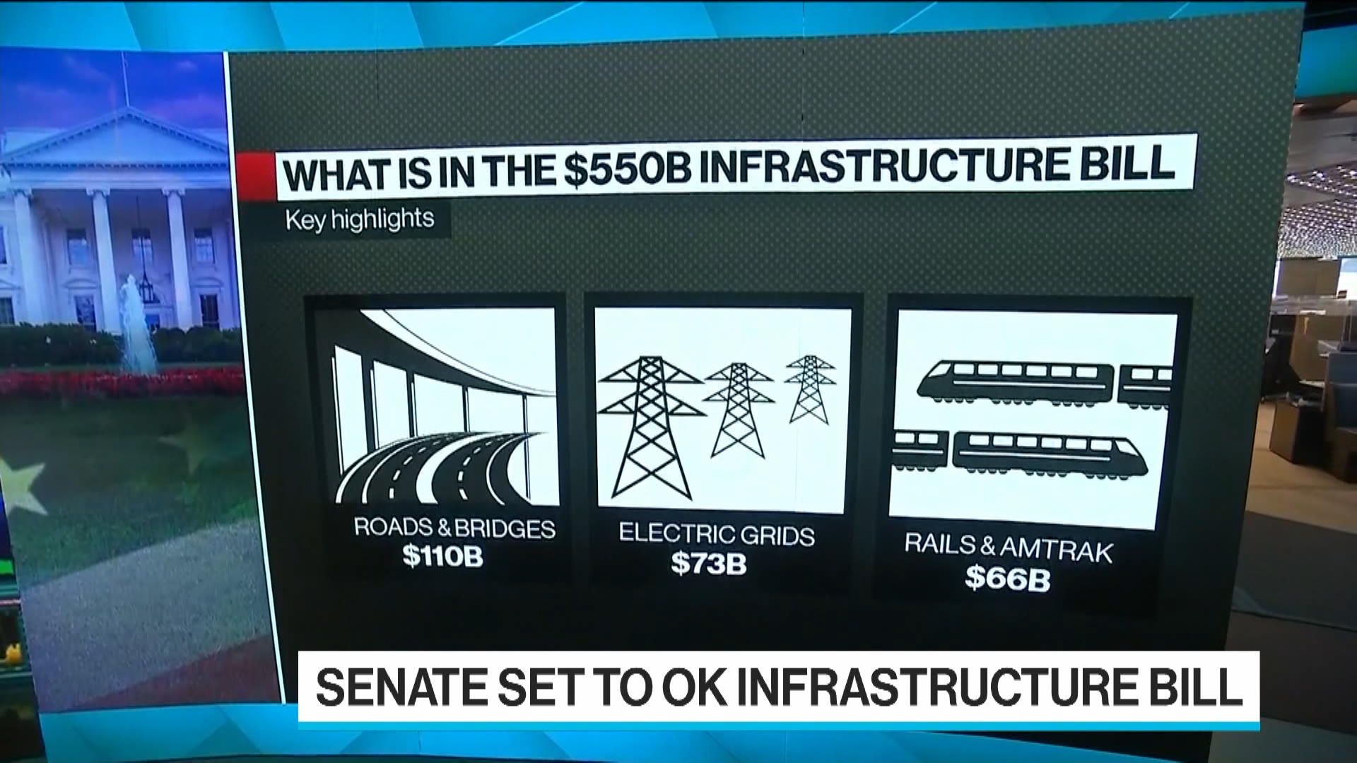 The separate infrastructure package includes $110 billion in new spending on roads and bridges, $73 billion for electric grid updates and $66 billion for rail and Amtrak. There is also funding for expansion of broadband service in rural areas and upgrades to drinking water systems through replacement of dangerous lead pipes.