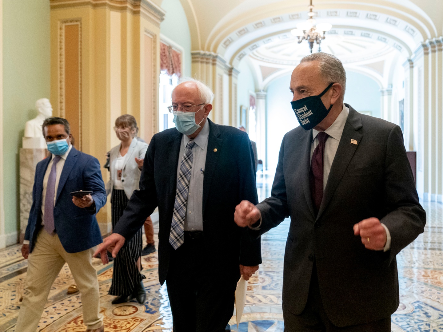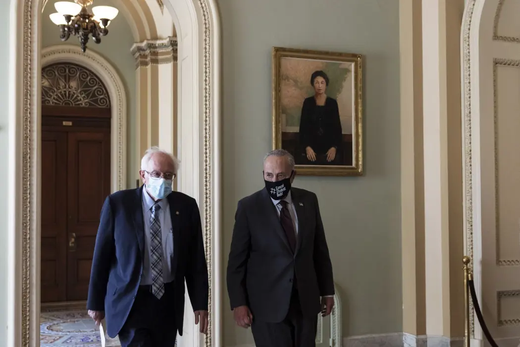 Bernie Sanders, left, and Chuck Schumer depart a meeting at the U.S. Capitol in Washington, D.C. on Aug. 9.