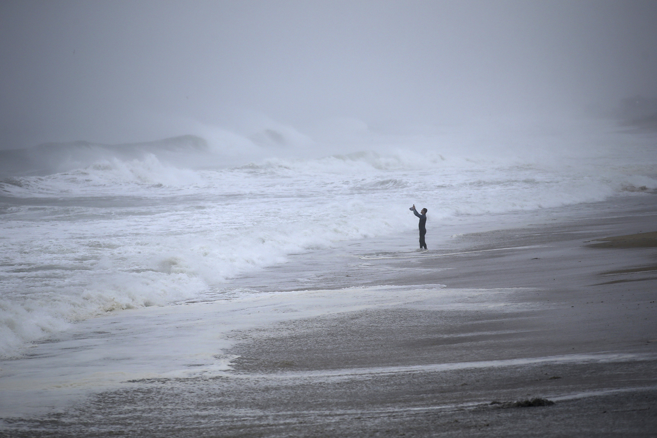 A resident takes photos of the waves as Henri approaches Westerly, Rhode Island, on Aug. 22.Photographer: Stew Milne/AP Photo