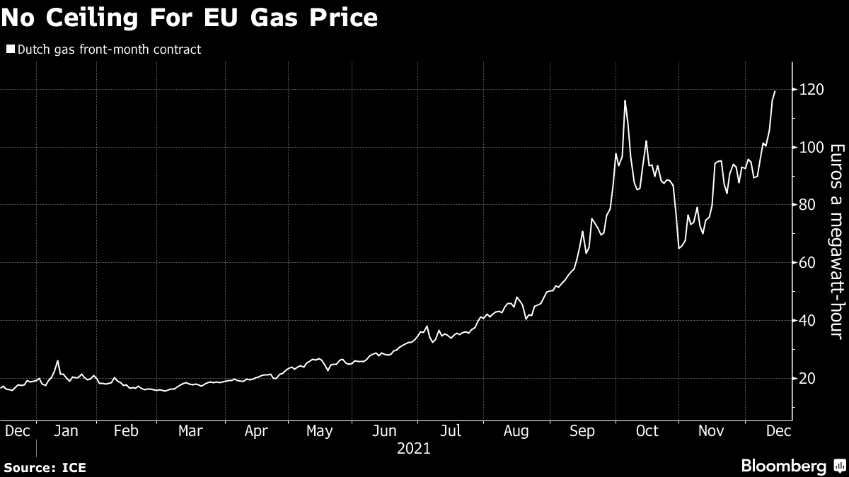 The current high energy prices threaten utilities and trading companies, many of which had to take out more debt or were forced to curb positions back in October, further risking supply. Poland’s state-controlled gas company PGNiG SA is seeking 2.7 billion zloty ($657 million) in short-term funding to “maintain flexibility” of operations, it said Monday.