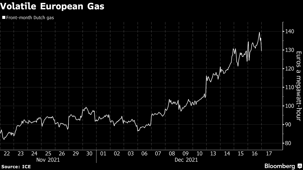Benchmark Dutch front-month gas fell as low as 120.60 euros a megawatt-hour and settled at 136.91 euros, down 4.1%. It’s still up 29% this week, as Russia’s supplies remain below last year’s levels and its controversial pipeline Nord Stream 2 is facing delays.