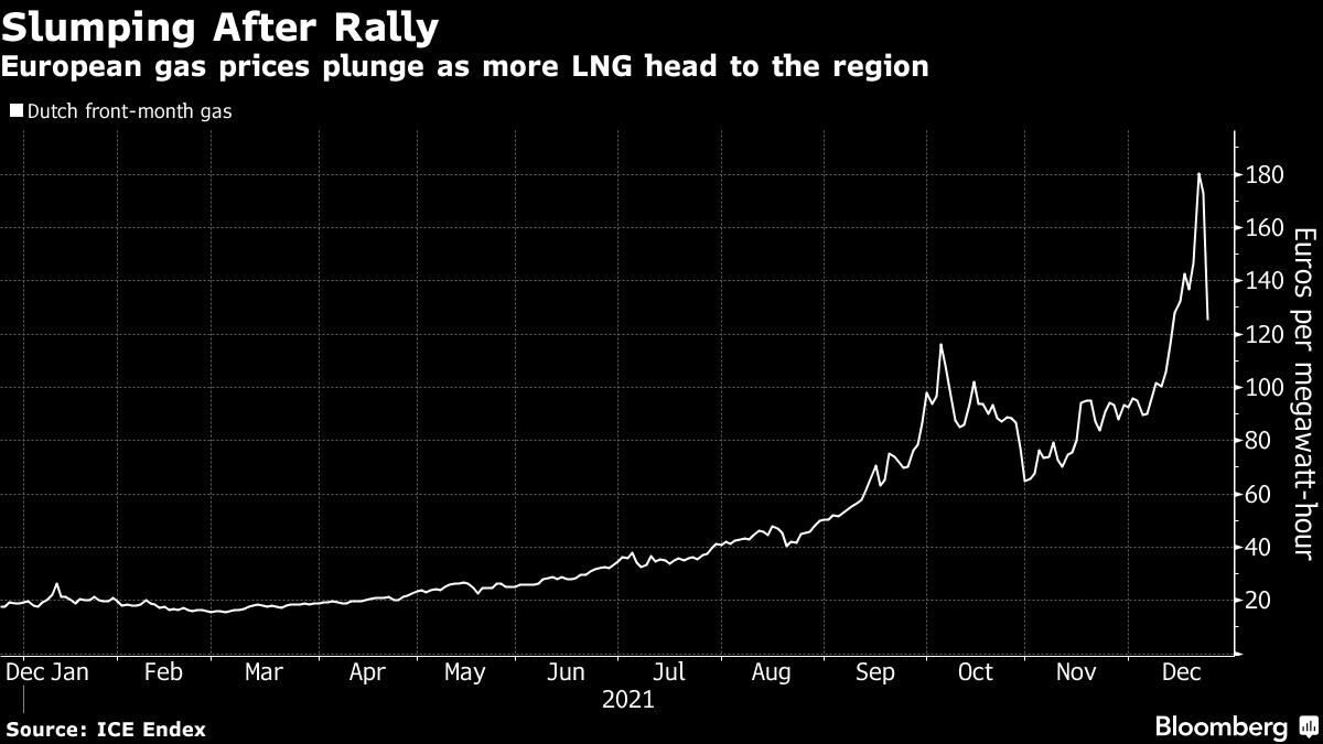 (Bloomberg) -- European natural gas prices plunged more than 20% on Thursday as this year’s stellar rally attracted a flotilla of U.S. cargoes.