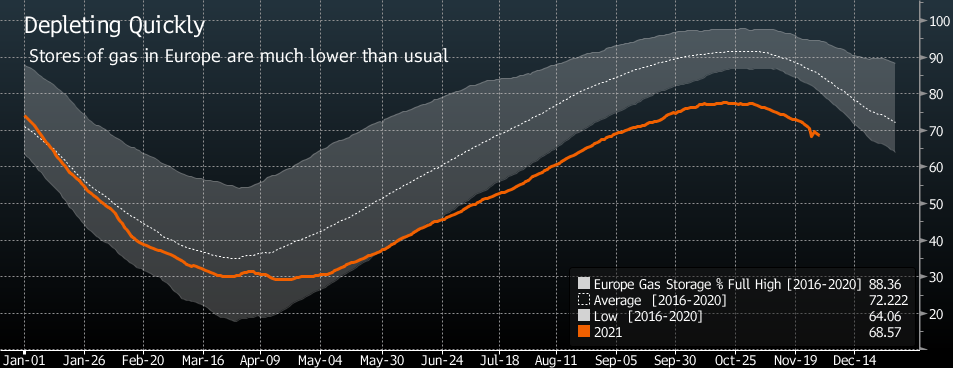 Part of the problem is that high gas prices over the summer meant storage facilities weren’t replenished as much as in past years and they’re being depleted quickly. Across Europe, sites are now about 68% full, down from 77% a month ago and well below the 10-year average of 85% for this time of the year, according to data from Gas Infrastructure Europe.