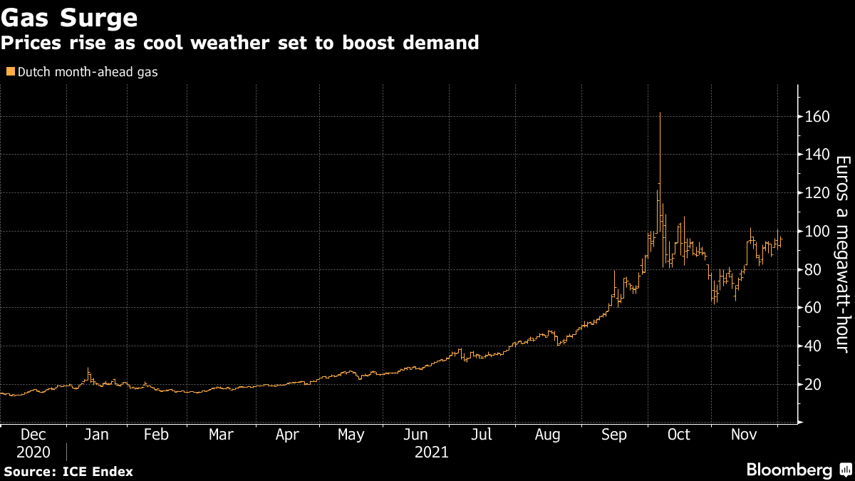 Frigid weather at the start of the year would boost gas consumption and deplete storage sites, potentially leading to a “dangerous” point when there’s not enough pressure to withdraw any more, he said. At that point prices, would go through the roof.