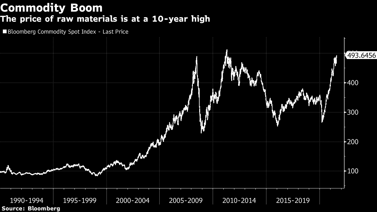 The economic rebound from last year’s Covid slump has powered an explosive rally in commodity prices as consumers forgo vacations and dining out and spend their money loading up on physical goods instead: everything from patio heaters to start-of-the art TVs. Politicians are helping, too, lavishing hundreds of billions on resource-heavy infrastructure projects.