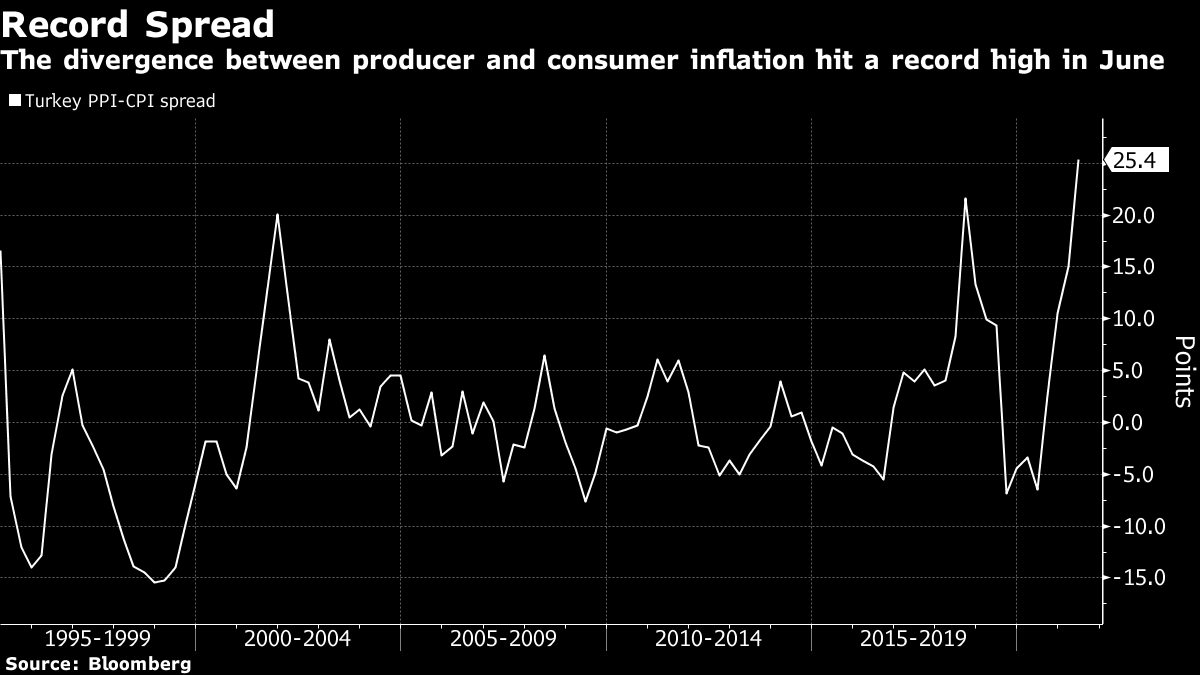 - Producer prices rose an annual 42.9% through last month, the most since October 2018, gains likely to eventually filter through to consumers. Turkey’s Treasury and Finance Minister Lutfi Elvan said last month that the rising divergence between producer and consumer prices is “quite disturbing”
