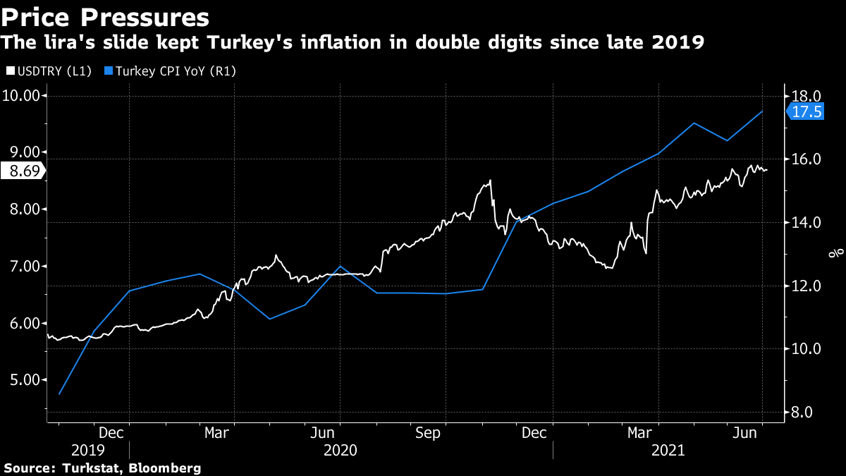 Monday’s data put Turkey’s benchmark rate adjusted for inflation at 1.47%, and also undermine previous guidance by Kavcioglu that the pace of price increases probably peaked in April. Price growth may accelerate further above 18% in July, according to Deutsche Bank AG economists, including Fatih Akcelik, who accurately forecast a sharp increase this month.