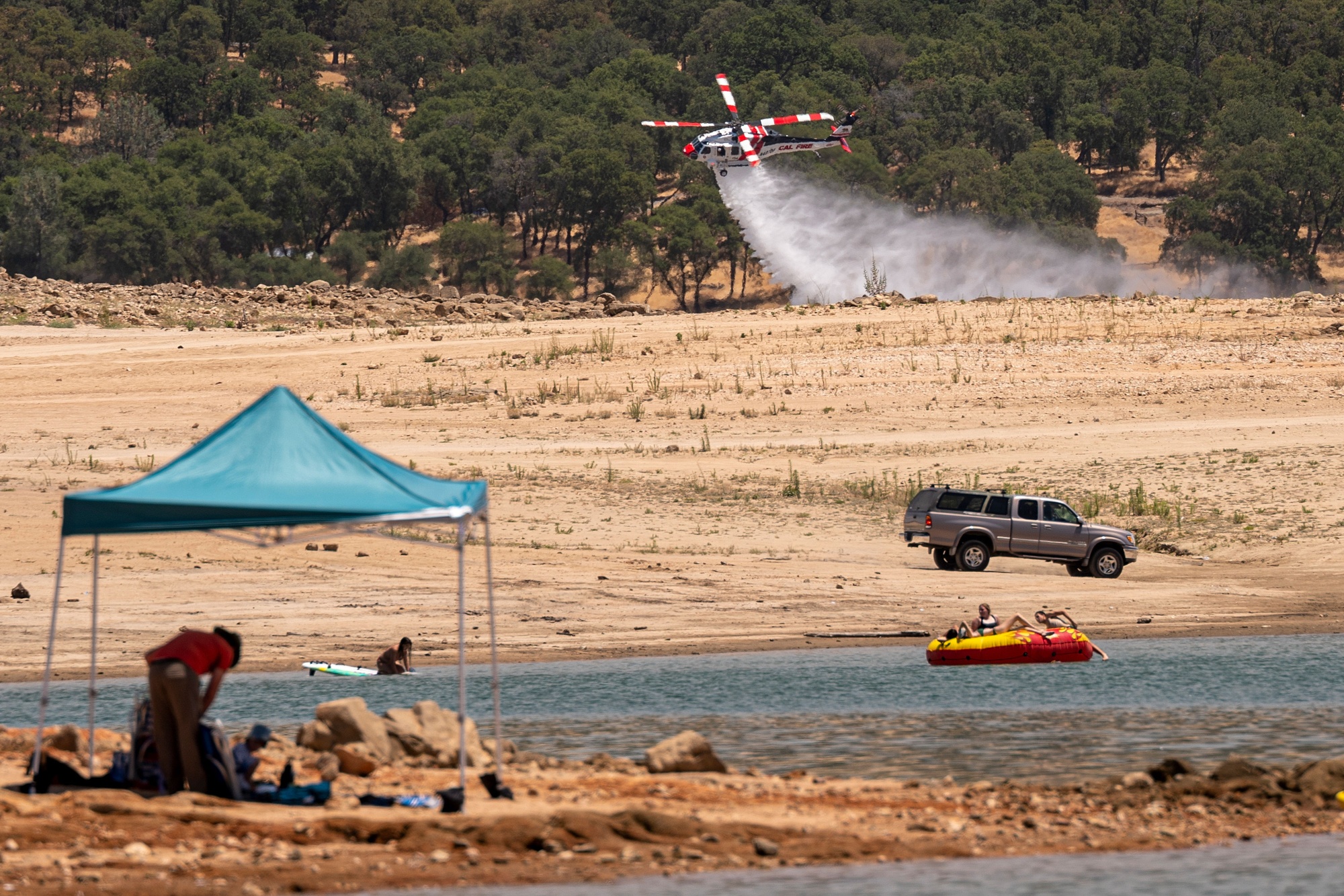 A CalFire helicopter practices water drops along Folsom Lake in Granite Bay, California, on June 16, 2021.