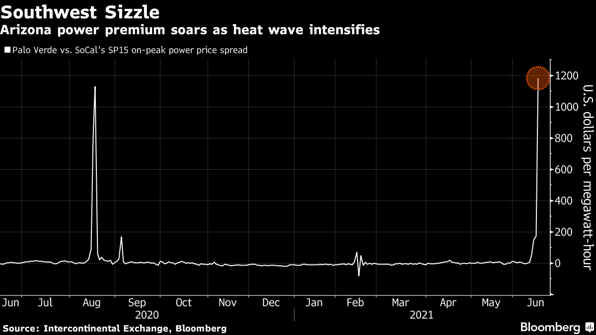 Meanwhile, traders betting that the intensifying heat will lead to electricity shortages across the western U.S. have driven a key spread between power prices in Arizona and those in the Los Angeles area to the widest it has ever been. Electricity regularly travels between Southern California, the Pacific Northwest and the Southwest, depending on which region needs it. But the blown-out spread reflects an increasingly uncomfortable truth: Climate change has brought about such extreme weather for all three regions that, at times, there isn’t enough power to go around.