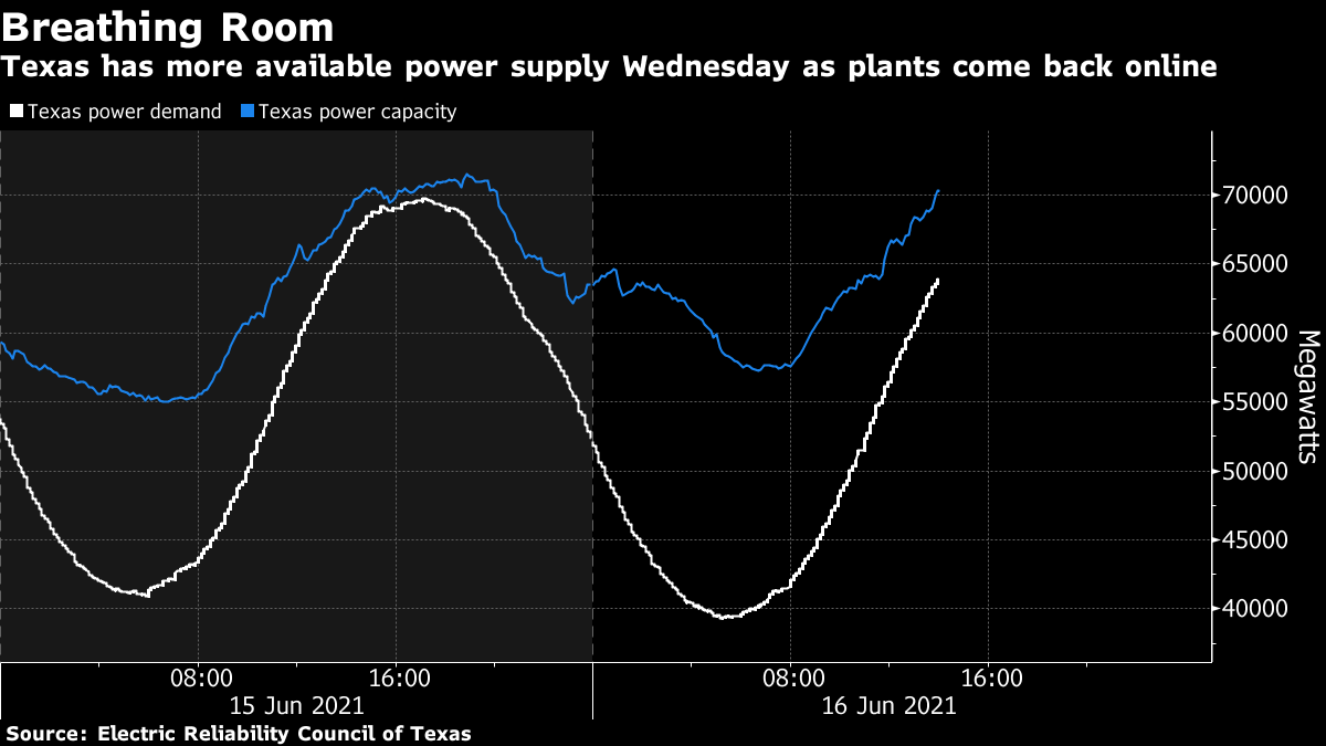 Texas supplies tightened in recent days after plants with as much as 12.2 gigawatts of generating capacity, enough to run about 2.4 million homes, unexpectedly shut down for repairs. That fell to 10.6 gigawatts Tuesday. About two-thirds of those out of service were natural gas, coal and nuclear plants. The rest were wind and solar, the grid operator said.
