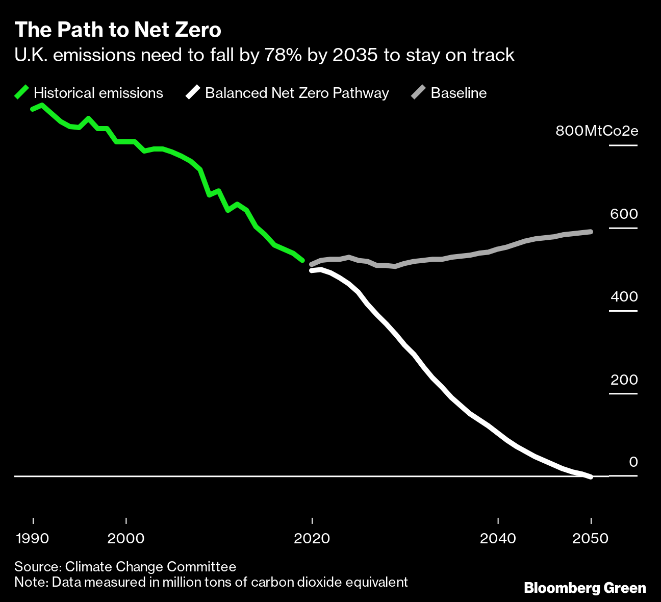 The U.K. has a legally-binding goal to phase out net emissions by 2050, and Johnson has announced interim plans to reduce them by 68% by 2030 and 78% by 2035, from 1990 levels -- the most ambitious targets among major economies.
