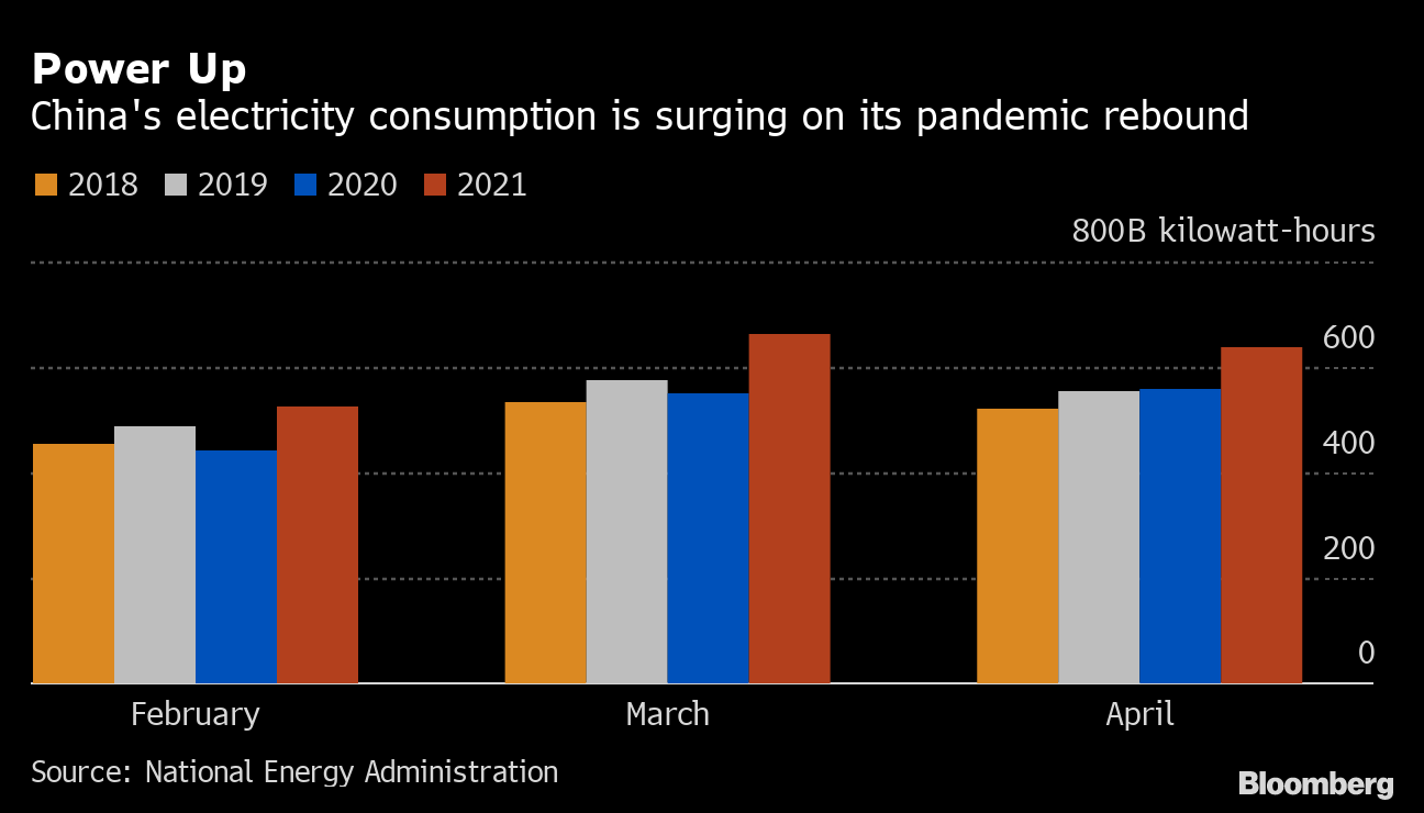 In China, the export- and heavy industry-led rebound has caused a surge in electricity use, with consumption climbing 20% through April compared with last year, and up 15% from 2019 levels, when Covid-19 wasn’t a factor. Temperatures in Guangdong, in the southern region of the country, have also been higher than normal.