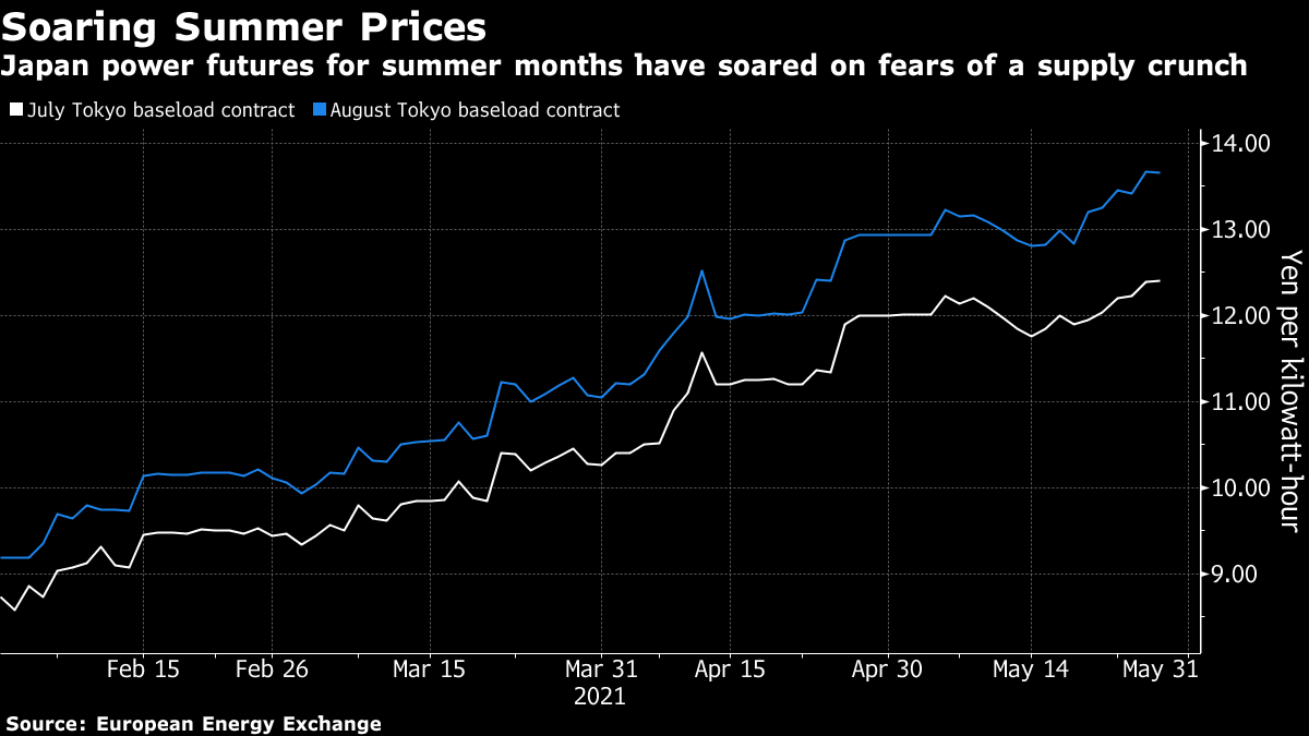 Japan power futures contracts for July and August delivery have surged by roughly 20% over the last two months in anticipation of a supply crunch. Hokkaido Electric Power Co., which operates in Japan’s northernmost island, expects to provide as much as 14% more power capacity to the main island of Honshu this summer compared to last year, the Nikkei newspaper reported.