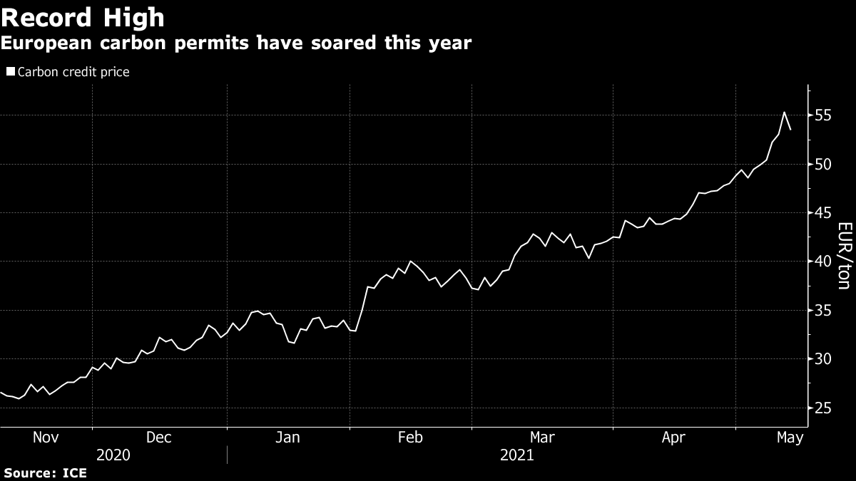 Germany said the rising cost of the pollution rights shows investor confidence in the EU’s cap-and-trade emissions program after its last reform. Last month’s deal by EU lawmakers to deepen the region’s target for cutting greenhouse-gas emissions at least 55% by 2030 from 1990 levels gave investors more clarity, the ministry said by email.