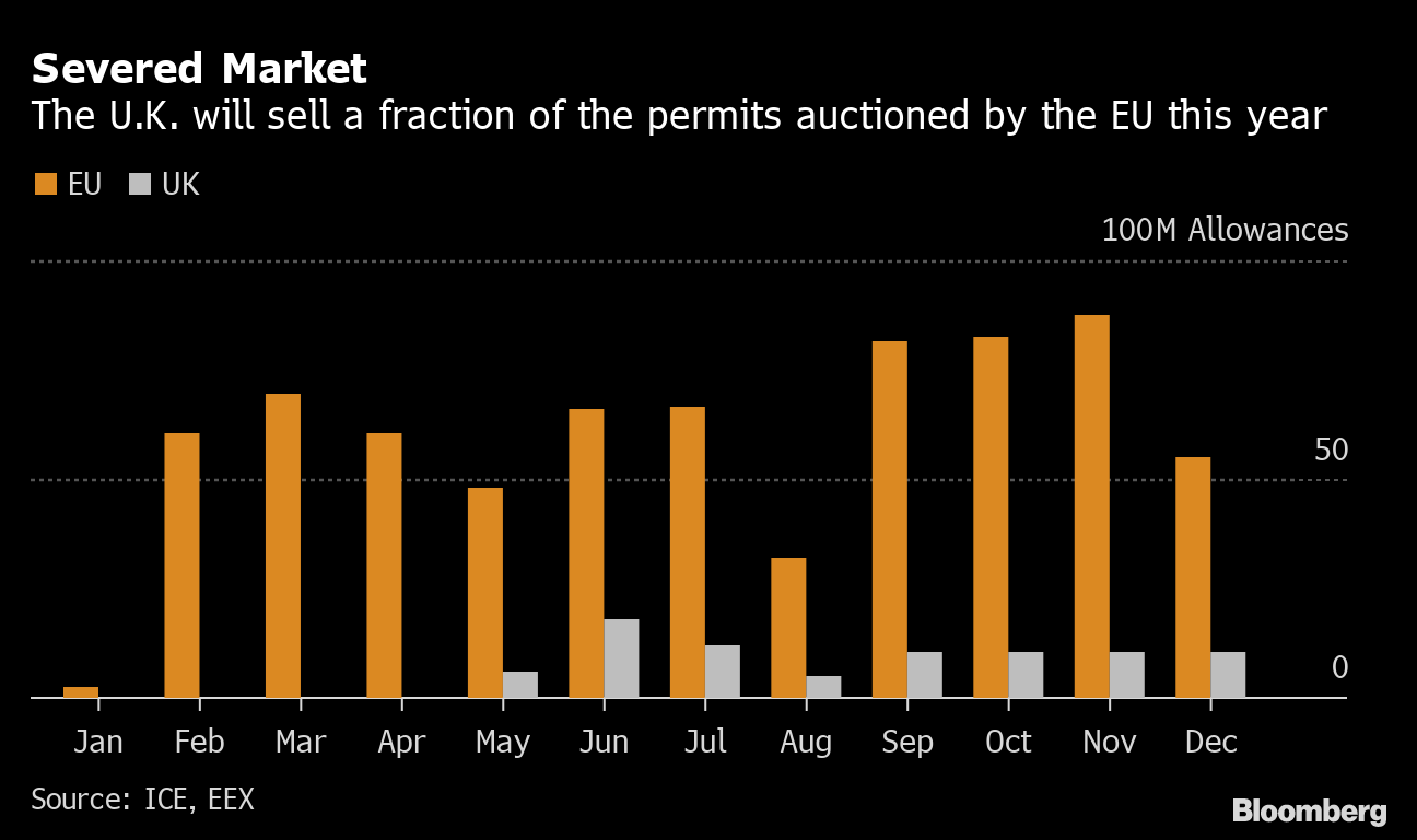 The main one is that it’s much smaller. That means there are far fewer industrial and power-sector emissions that need permits. The U.K. is set to auction about 83 million permits this year, compared to more than 700 million for the EU.