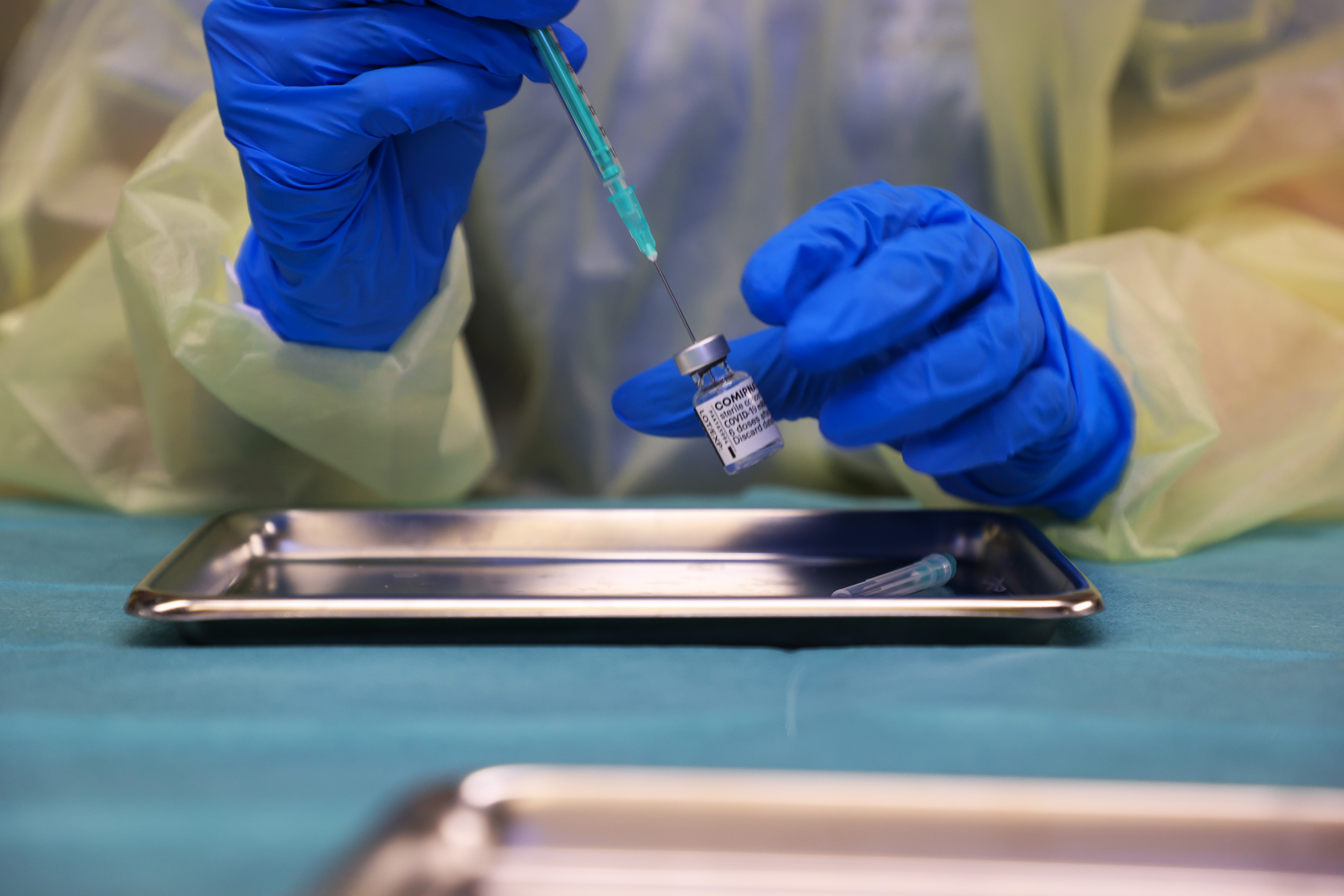 A healthcare worker prepares a dose of Covid-19 vaccine, produced by Pfizer Inc. and BioNTech SE, at a vaccination center in Gelnhausen, Germany.