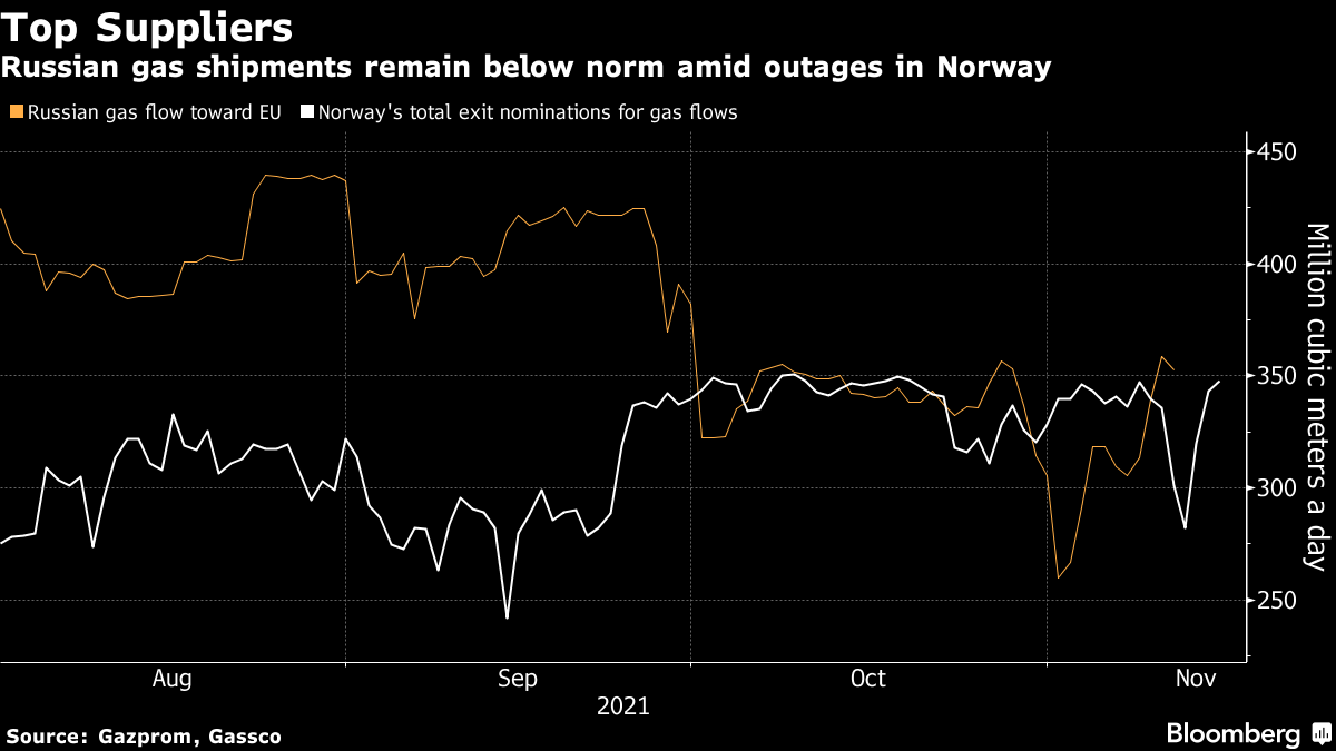 Meanwhile, in another bullish sign for the market, Gazprom PJSC decided against offering any spot gas on its Electronic Sales Platform for a third consecutive week. Temperatures are falling as Europe faces its first winter cold snap, while flows from Norway, the region’s second-largest supplier, are being impacted by outages.