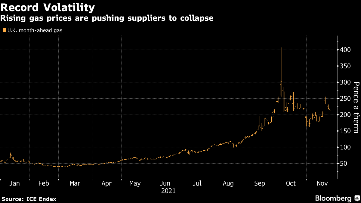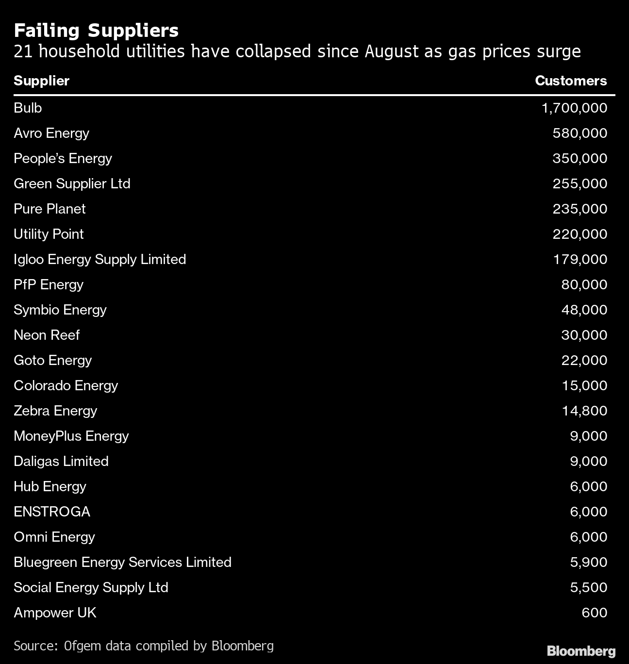 This is the first time the measure has been used in the energy sector, signaling a “tipping point” in the U.K.’s energy crisis, said Justina Miltienyte, an energy policy expert at Uswitch Ltd., a price-comparison service. Soaring gas and power prices have caused 21 suppliers to collapse since August, with most having sold energy at much lower fixed costs before prices almost quadrupled.