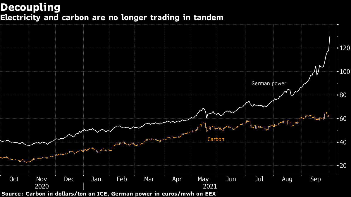 Carbon prices have already decoupled from power. Futures fell 0.2% to 61.63 euros a metric ton, while German power gained 0.6% to 130 euros a megawatt-hour.