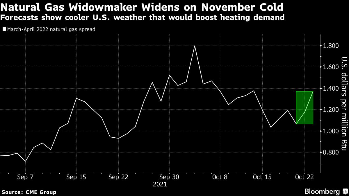One sign of growing supply fears: The so-called widowmaker spread between March and April futures, essentially a bet on how tight inventories will be at the end of winter, widened to $1.481, the highest since Oct. 14.