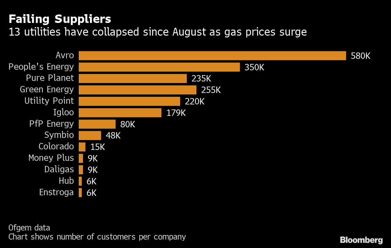 Thirteen suppliers have collapsed in the past two months and there will likely be more to come as surging prices sink firms. The latest, Daligas Ltd., was registered to an address in suburban north London and had 9,000 customers.