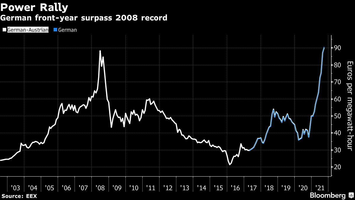 Next-year power in Germany, the regional benchmark, rose 1.2% on Monday to as high as 91 euros per megawatt-hour on European Energy Exchange AG. Gas prices have soared more than 170% this year, while carbon futures have climbed to 63 euros a metric ton, an all-time high.
