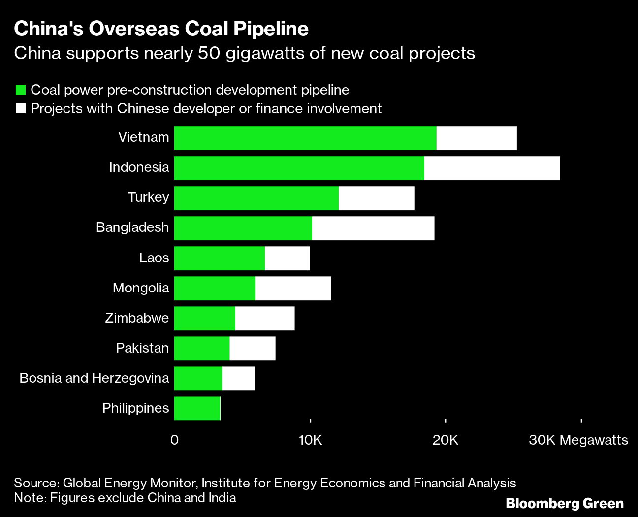 Though President Xi Jinping’s announcement lacked details, it could potentially lead to a significant dent in the world’s coal pipeline. China supports 56% of the projects planned outside its own country and India, according to the Global Energy Monitor database.