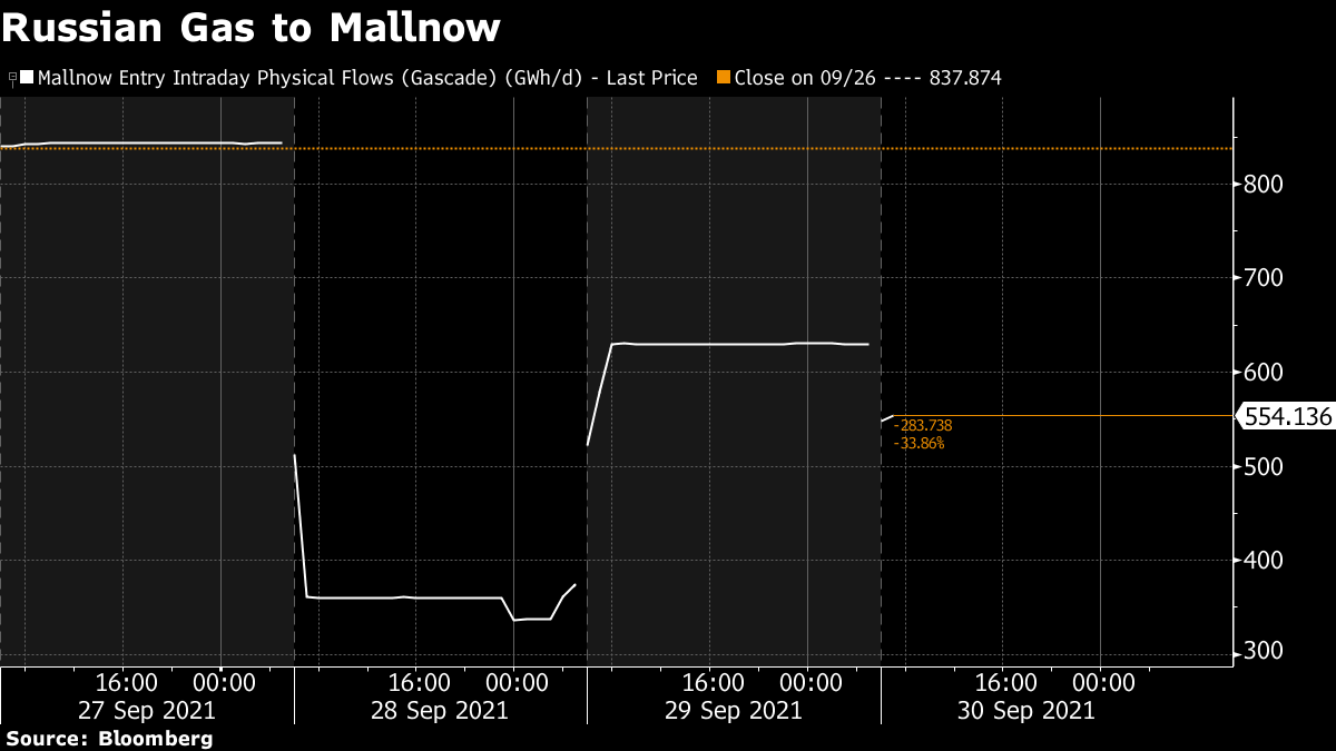 Russian gas flows to Germany’s Mallnow terminal dropped, paring yesterday’s partial recovery. Supplies via the major transit route are about a third less than at the beginning of the week. And European utilities seeking to buy more coal from Russia will also be disappointed as any exports are likely to be limited.