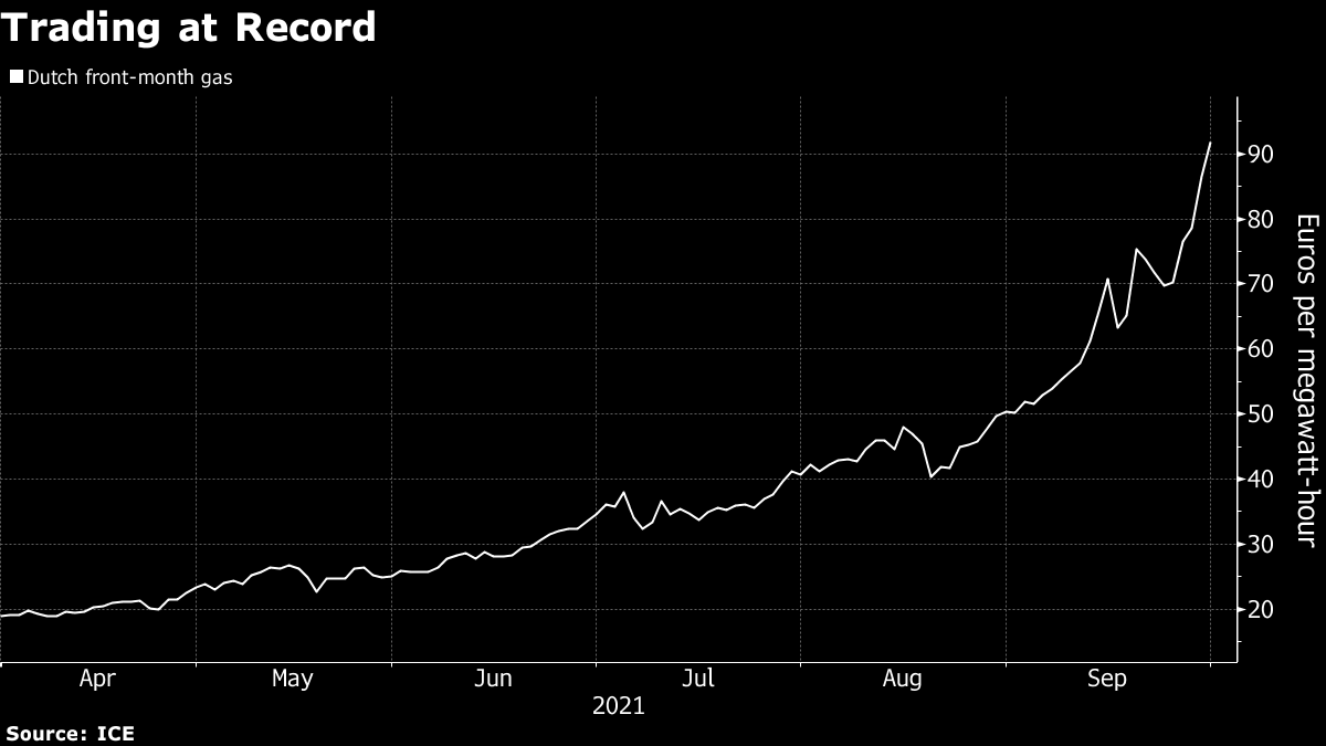 Dutch natural gas for next month, the European benchmark, rose as much as 13.4% to 98.23 euros per megawatt-hour. The U.K. contract also surged 17.4% to a new high of 252.53 pence a term. Both contracts have more-than-doubled in price over the past month.