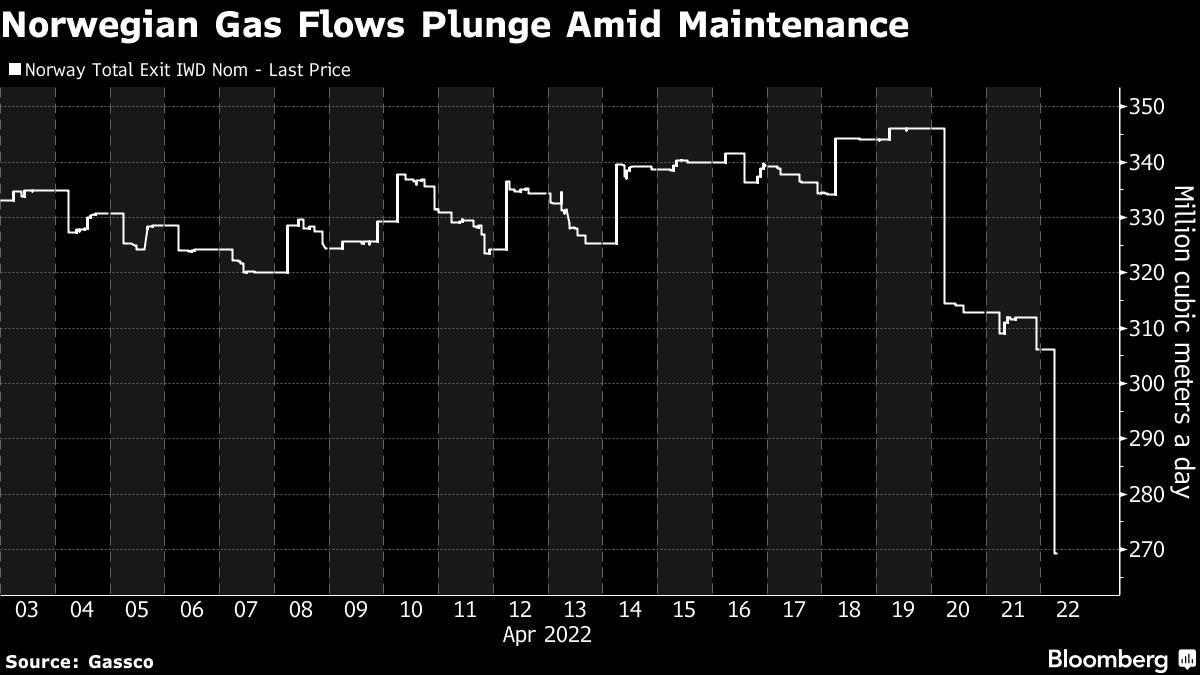 Supplies from Norway are set to slump to the lowest levels in more than three months with seasonal work at the giant Troll field on Friday, according to nominations from operator Gassco AS. There are also unplanned outages at the Kollsnes processing plant.