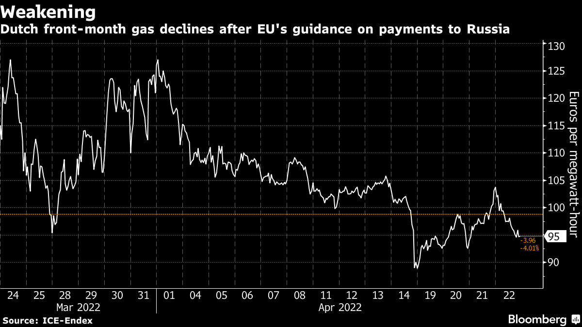 The continent’s benchmark gas futures were 4.8% lower, after rising as much as 5.2% earlier on Friday. Companies across Europe have been waiting for the EU’s final decision and the drop in prices signals traders expect a resolution on the payment issue can be found.