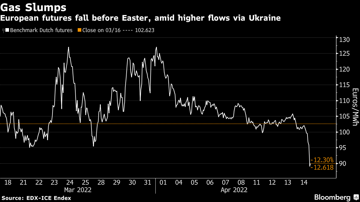 (Bloomberg) -- European natural gas prices slumped to the lowest since the start of the war in Ukraine, with the Easter holidays approaching and Russian President Vladimir Putin remaining largely silent on a potential halt to European gas supplies.