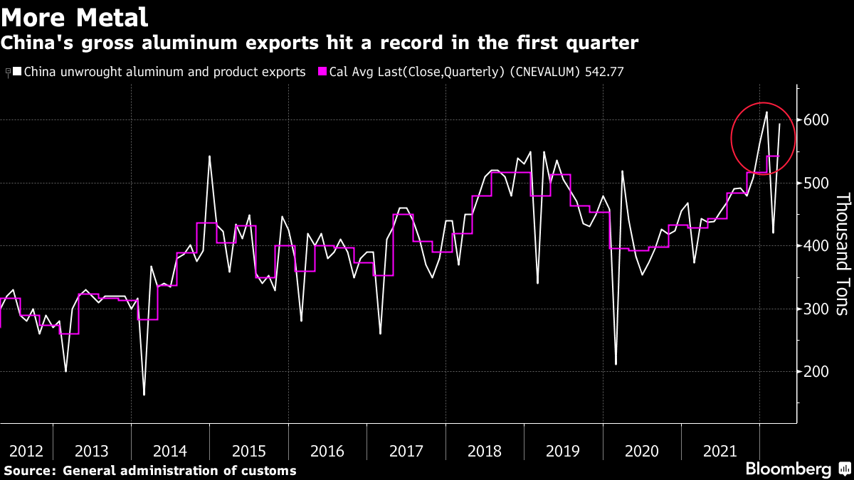 China is exporting unusually large volumes of metals, highlighting the precarious state of global supplies. Aluminum shipments from the world’s biggest producer rose to a record in the first quarter, while copper exports nearly doubled in March from the previous month. Zinc shipments also surged last month, and there are signs that steel exports will pick up.