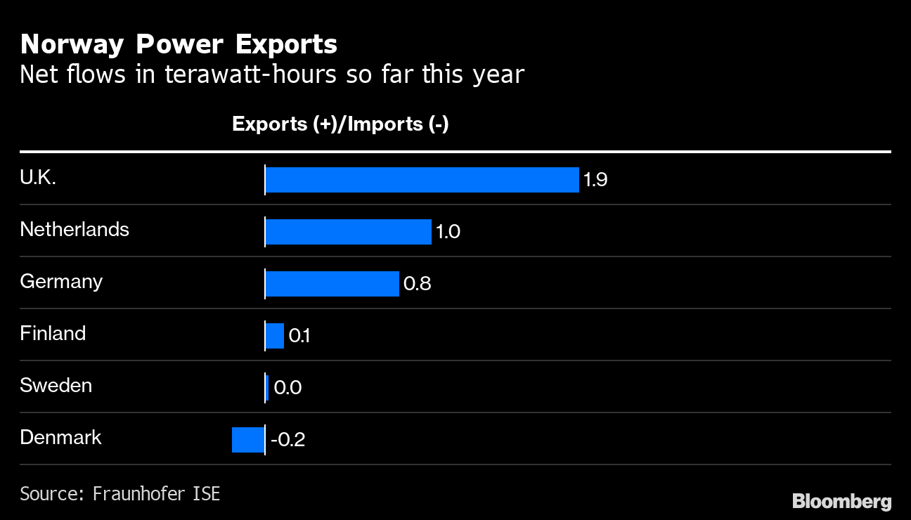 So far this year, Norway has exported almost 4 terawatt-hours, or about 7% of its total production, to Germany, the U.K. and the Netherlands. Hydro-reservoir levels in the most western price area is just over 10% full.