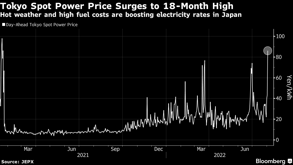 Wholesale power prices for next-day delivery for Tokyo doubled to 86.1 yen (66 cents) a kilowatt-hour on Tuesday, the highest since January 2021, according to data from the nation’s electricity exchange. Surging liquefied natural gas and coal prices are also boosting the cost to generate electricity in Japan, which depends on overseas fuel.